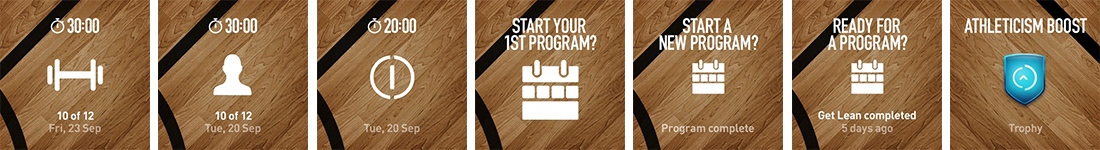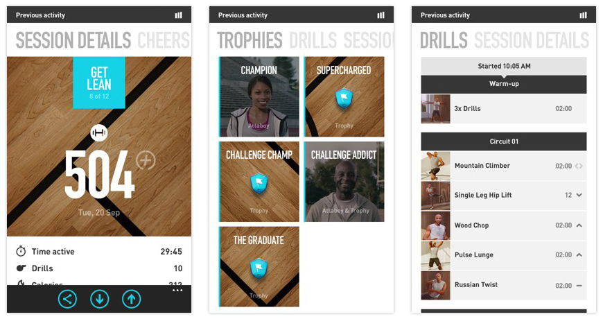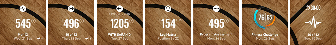 This provides a chronological list of drills that the user has engaged in, during their previous session. This covers warm-ups, circuits, challenges and cooldowns. It also calls-out completed and incomplete sessions.