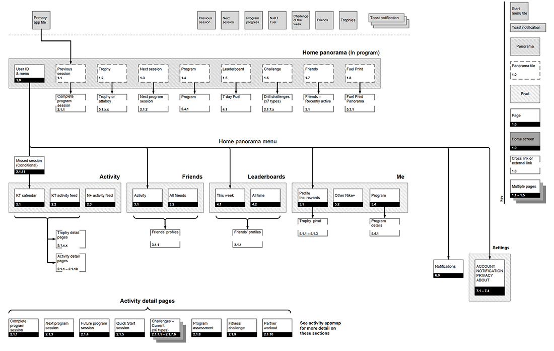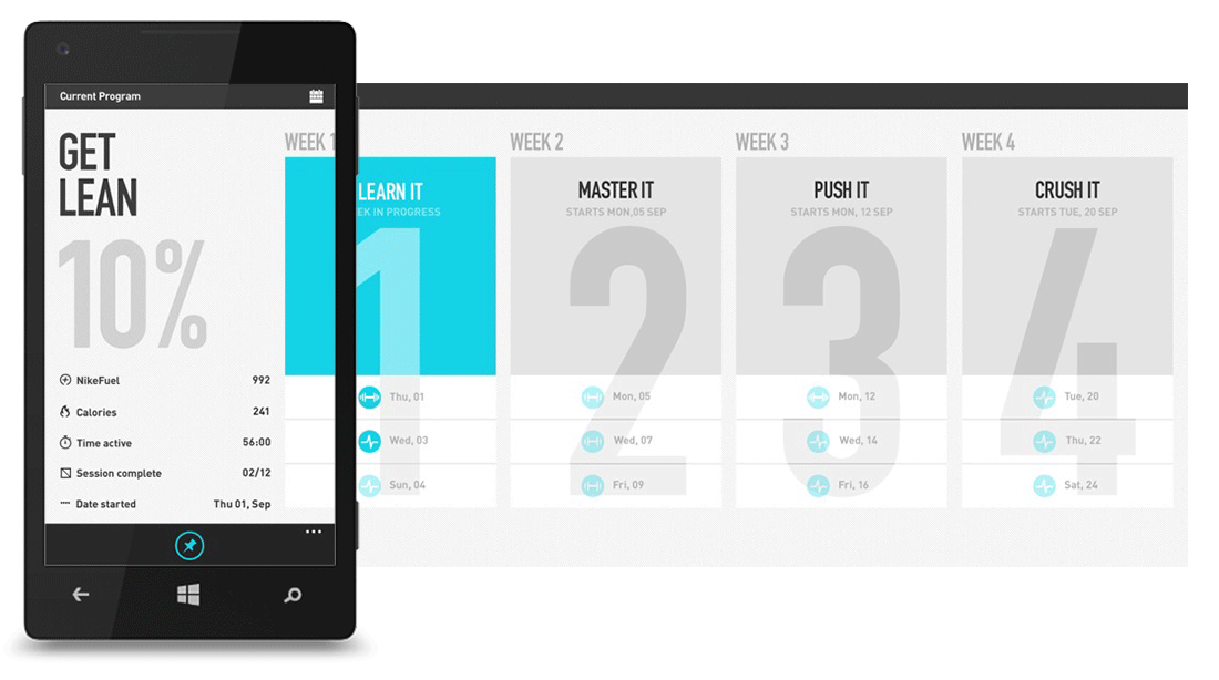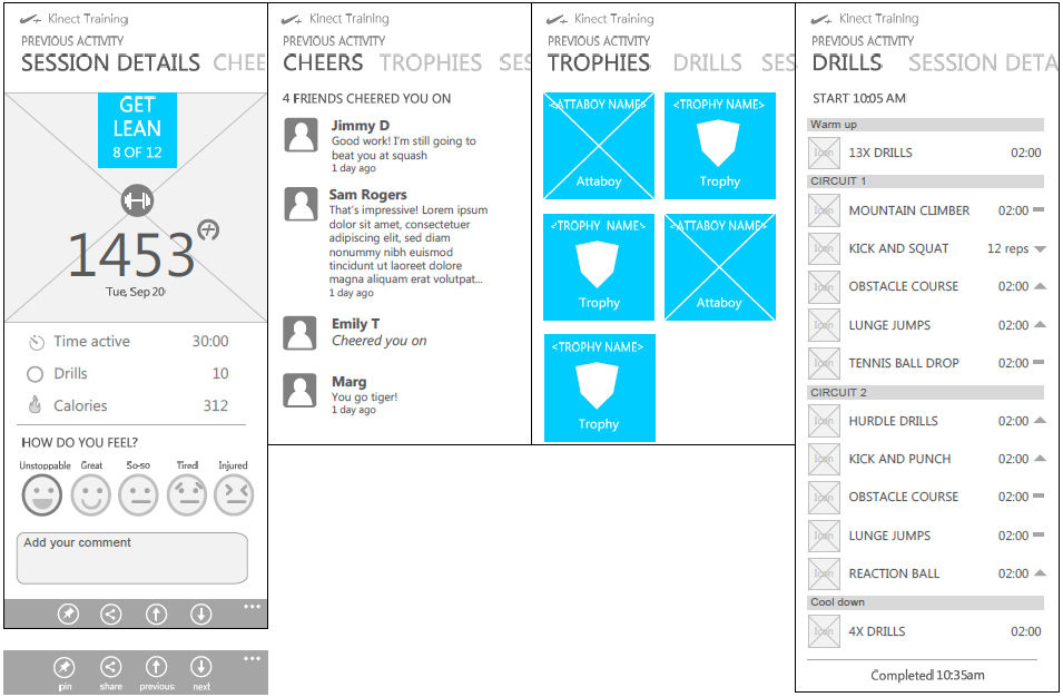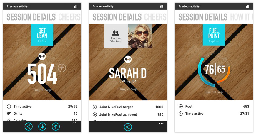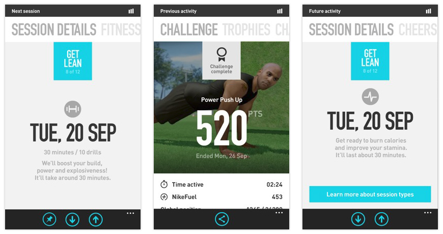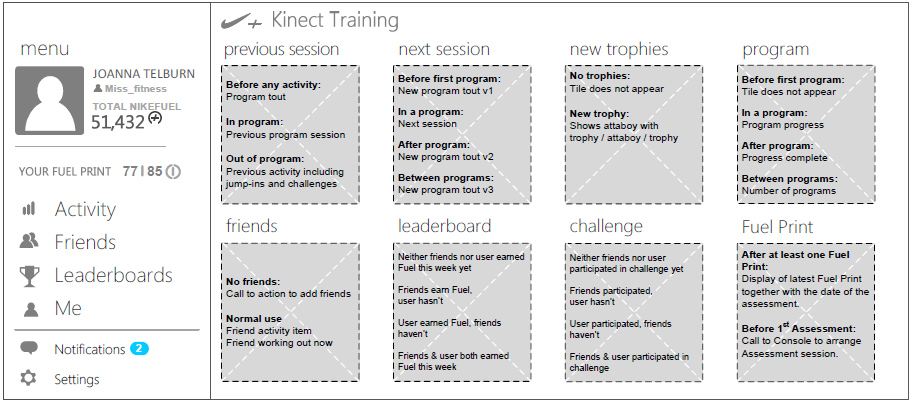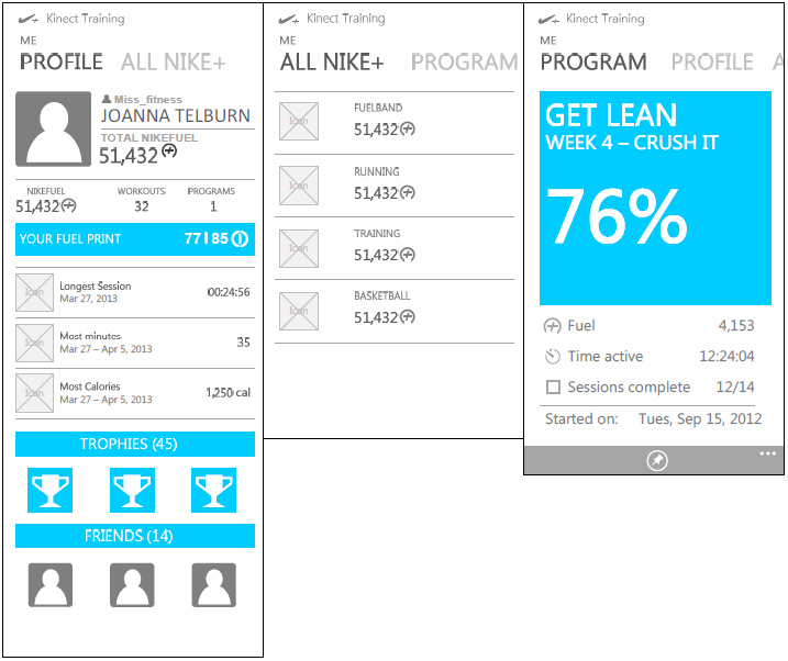 The N+KT App is an experience that will be built for the Mobile phones that allows users to take their experience using Nike + Kinect training beyond the console experience. Users will be able to view their Console activity, get notified when scheduled sessions are coming up, and connect with other XBOX/Nike+ users.