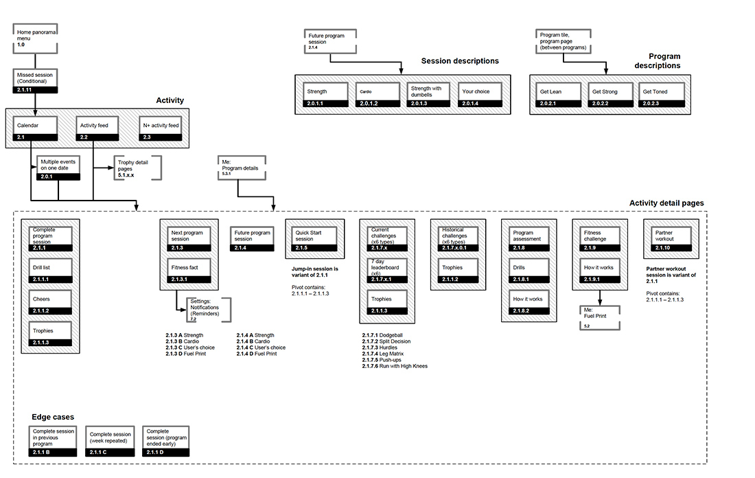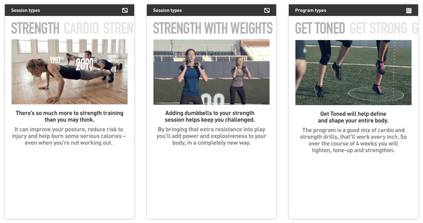 The mobile experience should recognise and reward the users hard work on console. At any time, they can open the app to view their progress towards being Athlete Fit, shown both by program and through individual session analysis. The app will act as a social hub with updates from friends and will unlock rewards to celebrate your accomplishments.
