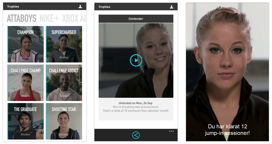 Clicking the attaboy reveals a full screen video and on completion, reverts to a summary screen of the attaboy. Clicking trophies shows the name, icon and brief description of the award.